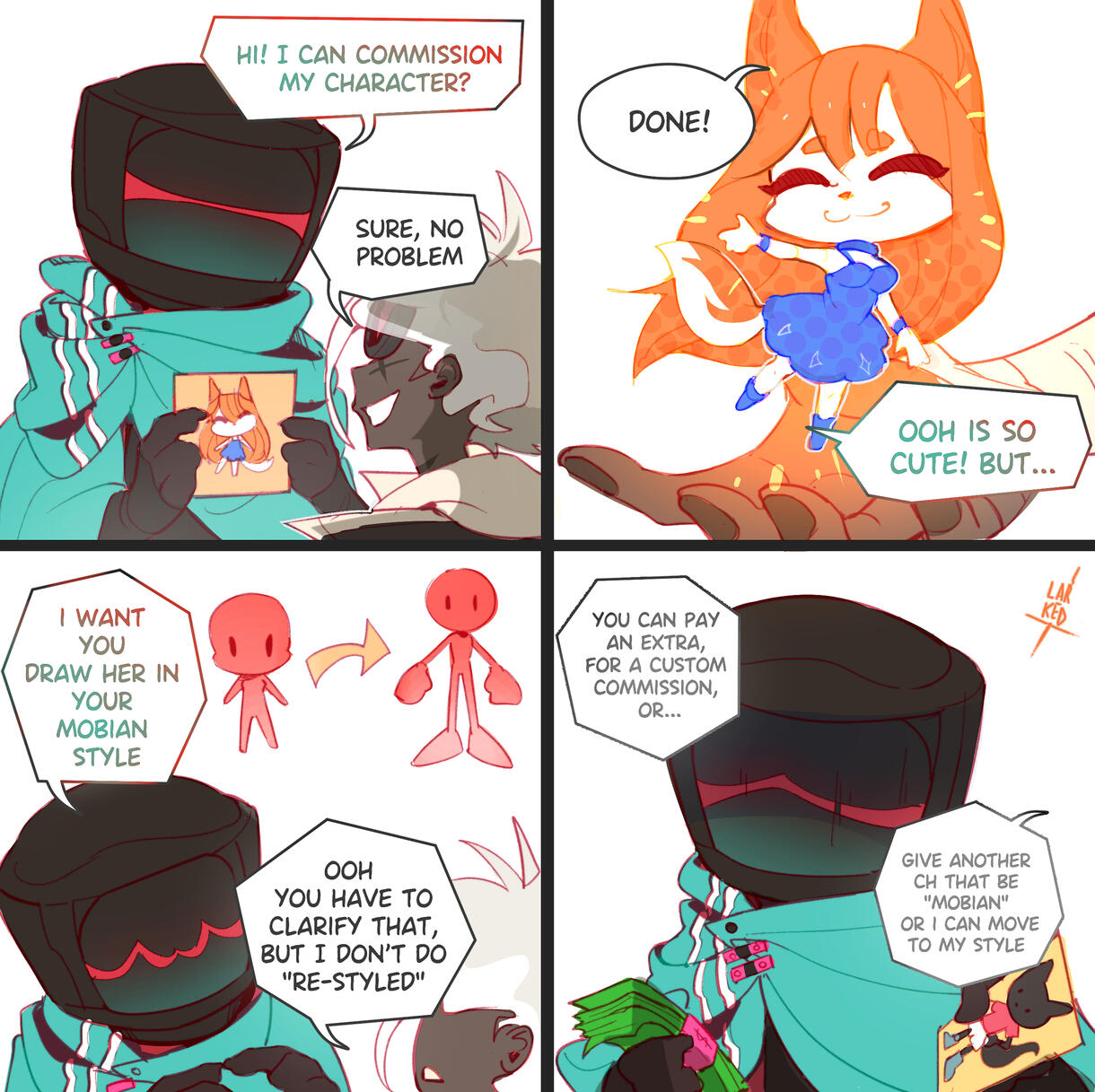 I no re-style the character. If you have a chibi character (with small feets and hands) I can't move to my mobian style, same with furry/anthro characters. I deliver these characters in the same style that the buyer gave me.